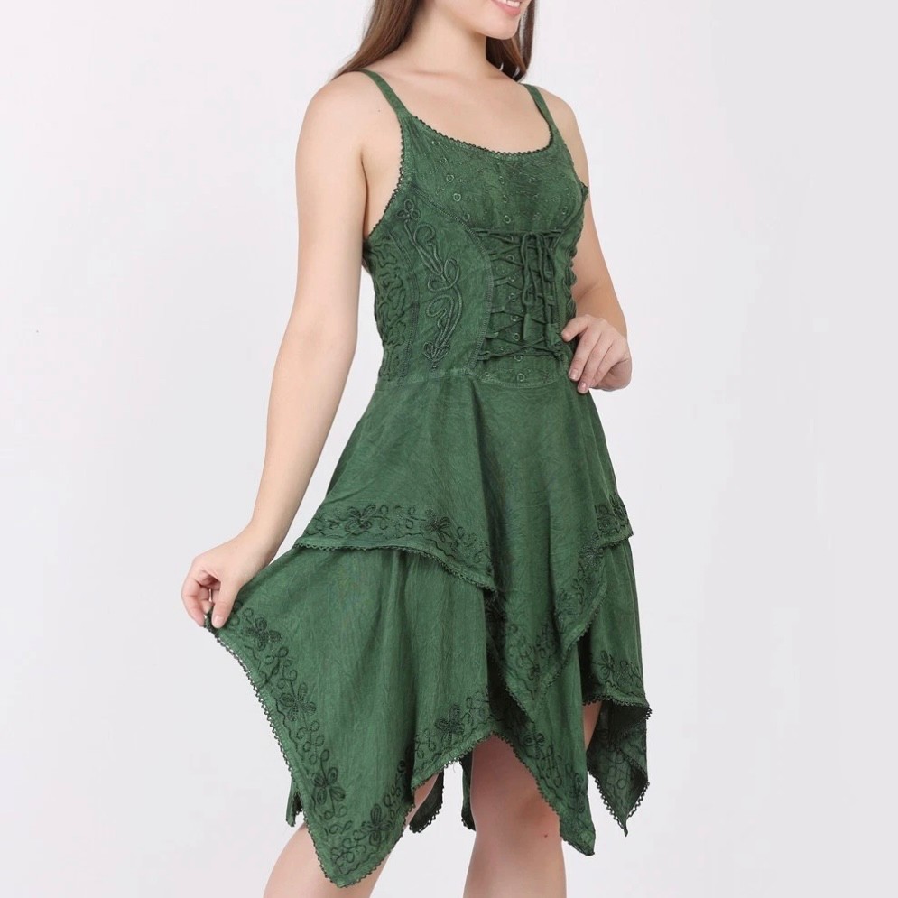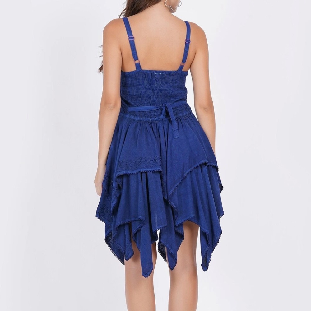 -Style: Summer, Sleeveless, Fit & Flare, Bohemian, Lace-up Bodice, Handkerchief Hemline