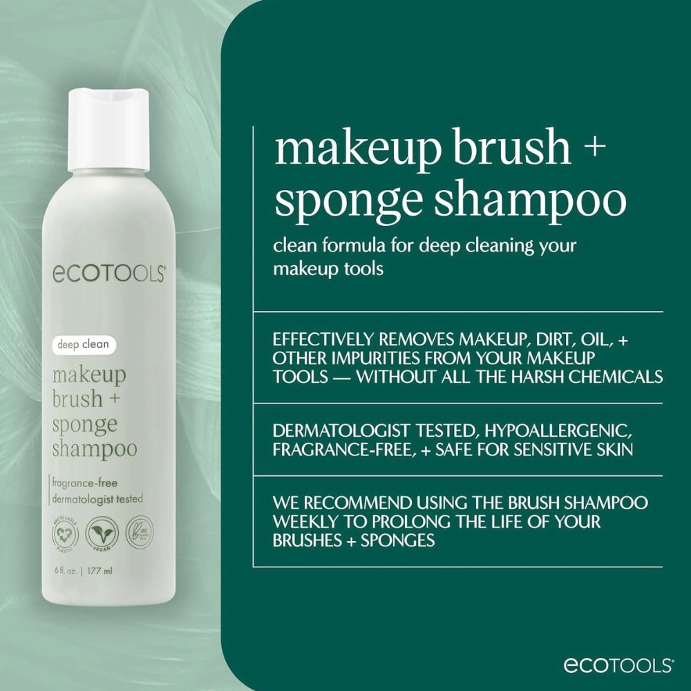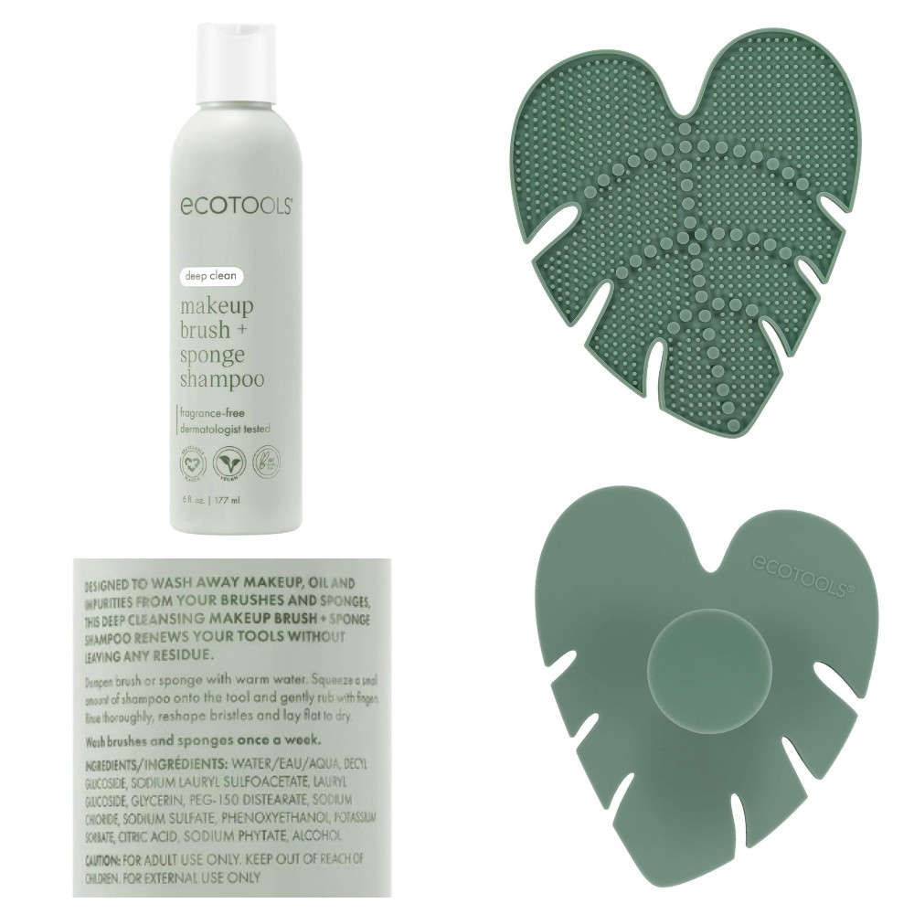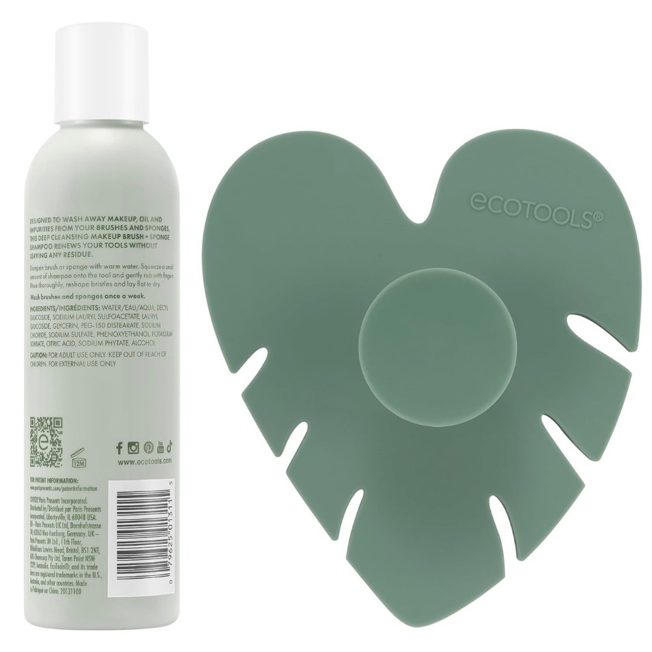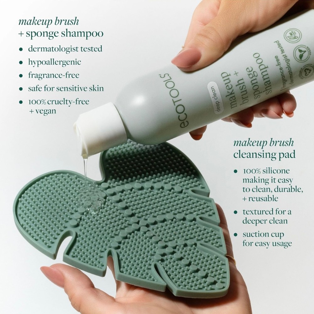 The EcoTools Makeup Brush Cleansing Pad + Deep Clean Shampoo Bundle is your perfect cleansing duo for deep cleaning your makeup brushes. The makeup brush cleaner bundle includes our brush cleaner mat and makeup brush cleanser. The brush cleaning pad is designed with a suction cup for mess-free usage, and the textured pad helps to scrub all the makeup, oil, and other impurities from your favorite makeup brushes. The Eco Tools Brush Shampoo is made with gentle, plant-based ingredients that cleanse makeup tools properly without all the harsh chemicals. It's dermatologist tested, hypoallergenic, and fragrance-free. This makeup brush cleaner is also free of parabens, phthalates, and petroleum-based ingredients but still manages to leave brushes clean, soft, and durable. The EcoTools makeup brush cleaner mat is made from silicone, making it reusable.