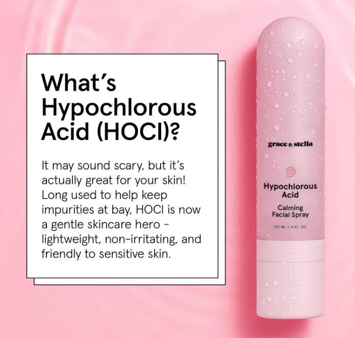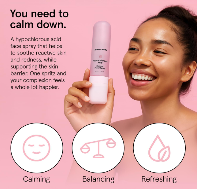 - Calm Angry Skin: Give stressed skin some kindness with this ultra-calming facial spray. Powered by naturally occurring hypochlorous acid (HOCI), it helps reduce redness and irritation, while supporting your skin barrier for a happier complexion.