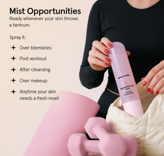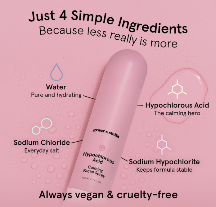 - Gentle on Sensitive Skin: A hypochlorous spray that plays nice with even the most sensitive skin. With just four simple ingredients, this toner spray for face is a gentle, skin-friendly mist that refreshes without sting, fuss, or extras you don’t need.