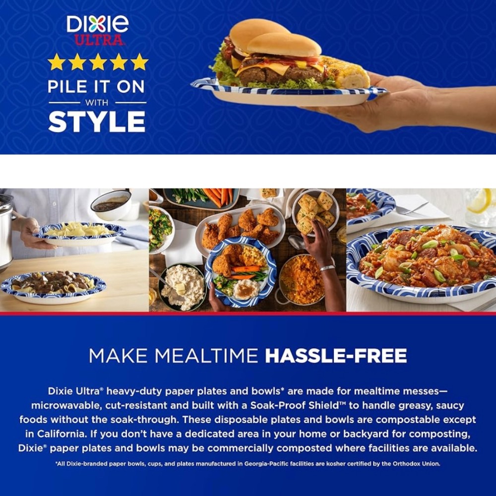 Count on Dixie Ultra® products when you're entertaining family or friends or planning a special event or celebration. After all, whether you're hosting a holiday meal, planning a party or just grilling in the backyard, you'll appreciate the convenience and peace of mind Dixie Ultra® products bring. All Dixie-branded paper bowls, cups and plates manufactured in Georgia-Pacific facilities are kosher certified by the Orthodox Union. Stock up today! *If you don't have a dedicated area in your home or backyard for composting, Dixie Ultra® plates and bowls may be commercially composted if such facilities exist in your area.