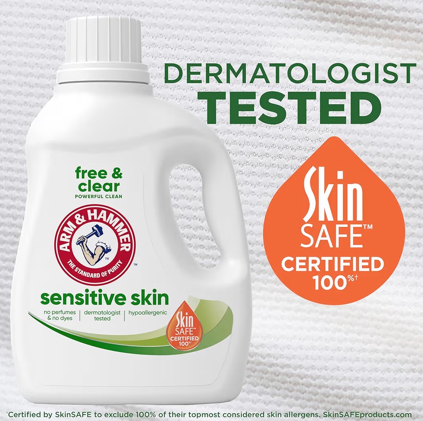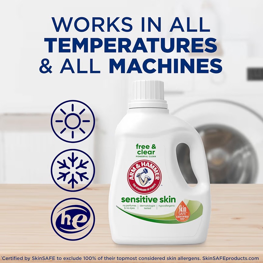 ARM & HAMMER Sensitive Skin Free & Clear Liquid Laundry Detergent is gentle on skin, but powerful on dirt. This free and clear detergent is concentrated with 2X powerful stain fighters in every load versus the leading value detergent, making it powerful enough to handle your toughest loads in all wash temperatures, even cold water. Free from dyes, perfumes and preservatives, this hypoallergenic laundry detergent is dermatologist-tested and certified 100% by SkinSAFE (1). This low-sudsing laundry soap rinses clean and works in standard machines and High Efficiency (HE) models as an effective and efficient hypoallergenic detergent. Blended with trusted ARM & HAMMER Baking Soda, this HE detergent is tough on odors, dirt and stains, leaving clothes clean and fresh.