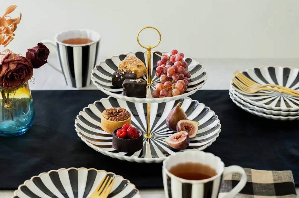 Grace Teaware Beetlejuice Black & White Scallop Fine Porcelain 2-Tier Server
