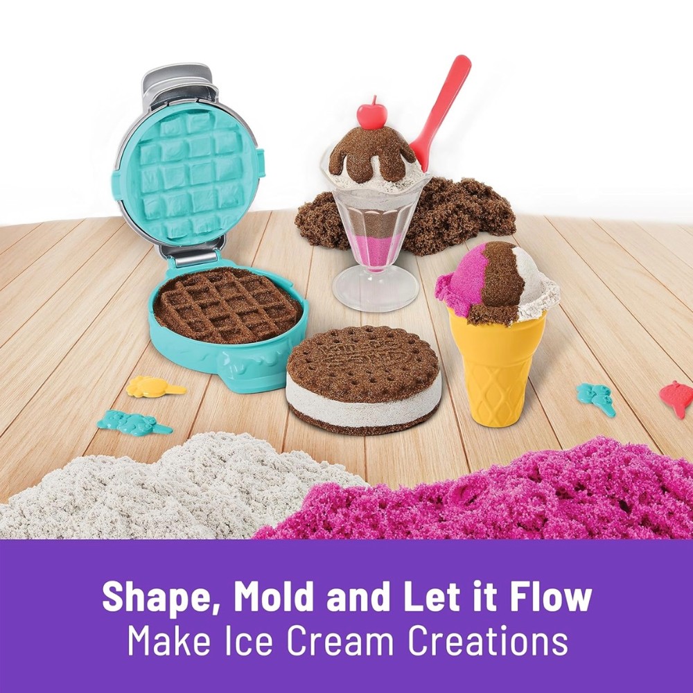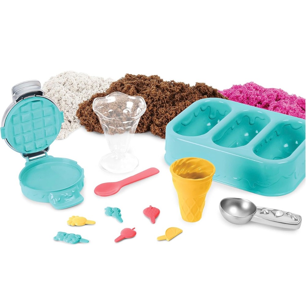 • 6 Kinetic Sand tools for serving: This playset has everything you need to create your treats - a freezer-style tray, scoop, sundae cup, spoon, ice cream cone, waffle press & 6 topping accessories