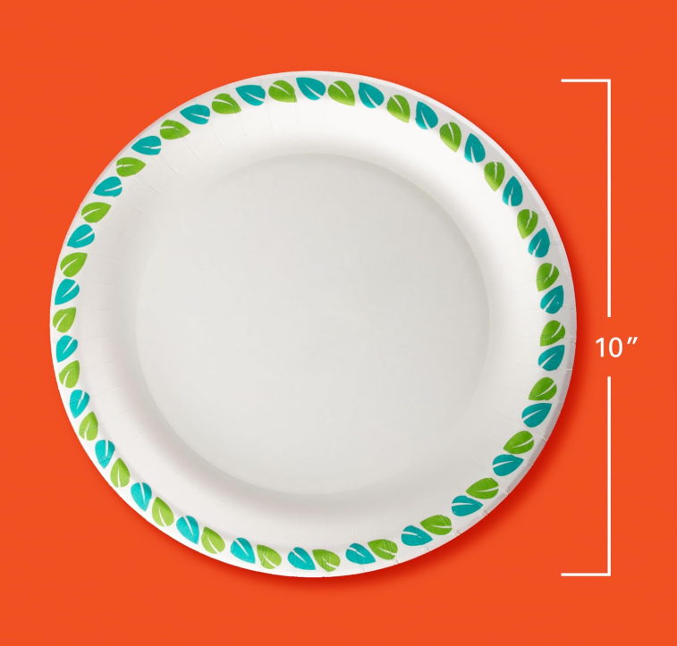 Printed Paper Plates—Contains twenty 10 inch Hefty compostable paper plates with a green leaf printed rim