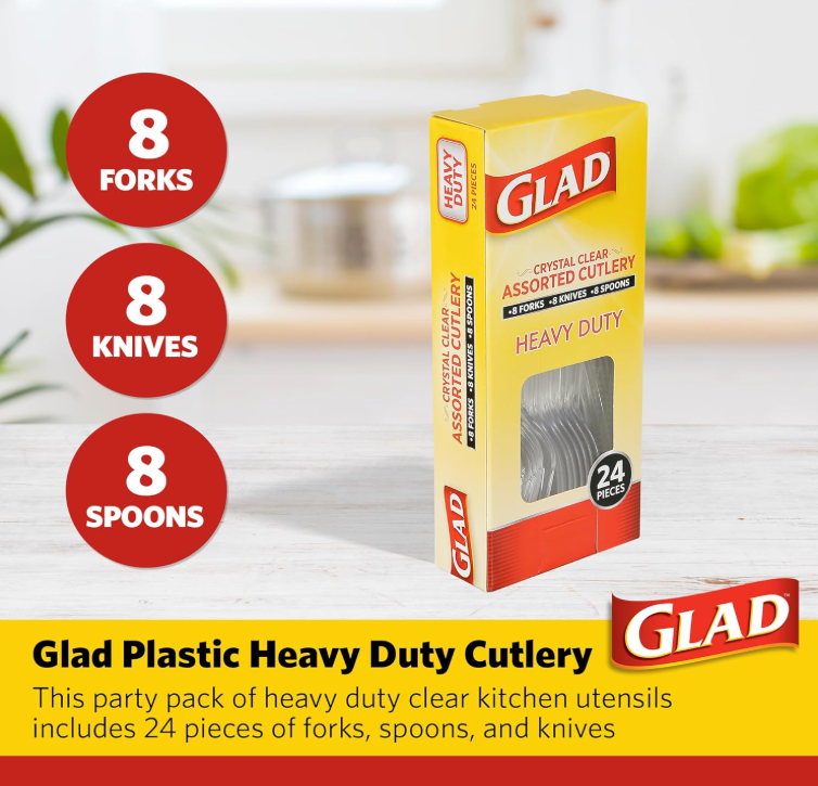 - EXTRA STURDY UTENSILS — Glad heavy weight cutlery resists breakage. This means no snapping forks during your meal. Clear plastic flatware is perfect for all types of foods whether it be fluffy birthday cake or sticky Buffalo wings