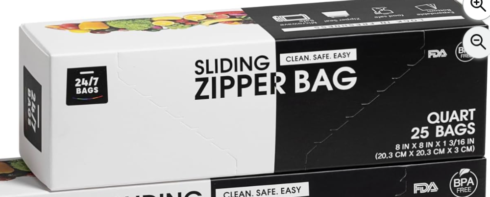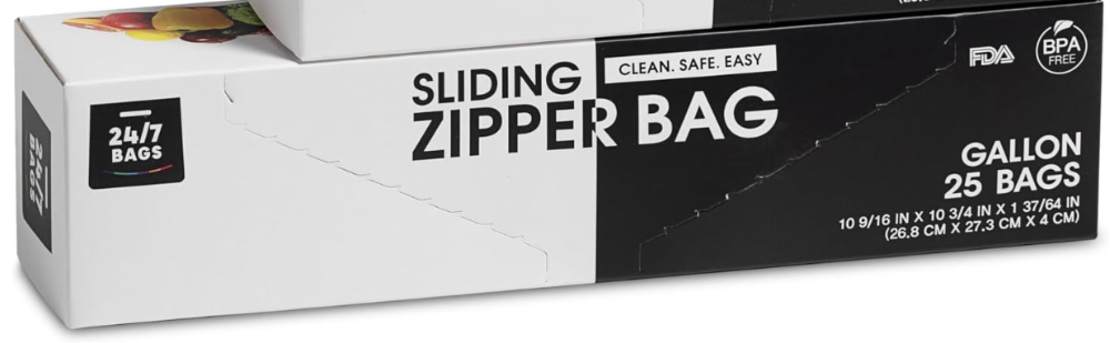 - Gallon-size Sliding Zipper Top Bags, 25-count bags per each box