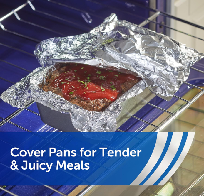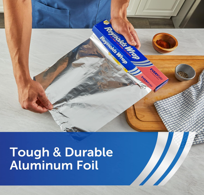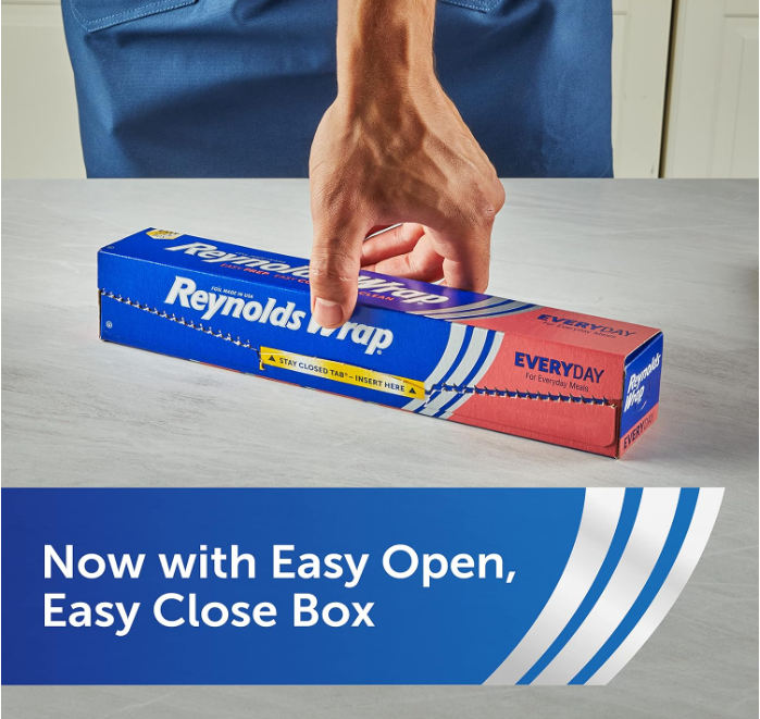 For 75 years, Reynolds Wrap Aluminum Foil has been the trusted choice for home cooks seeking unparalleled strength and versatility. Reynolds aluminum foil is designed to be tough and durable, making it the go-to solution for all your kitchen cooking needs. Whether you're protecting your leftovers from freezer burn or lining a baking sheet for easy cleanup afterwards, Reynolds Wrap Everyday Aluminum Foil is a versatile tool for a variety of kitchen tasks. Seal in flavor and moisture by wrapping meats and vegetables in foil packets for grilling, roasting, or baking, ensuring delicious, tender results with every recipe. And when it's time to clean up, just toss the tin foil away—no scrubbing required. Plus, the innovative Easy Open and Stay Closed tab on the side ensures your aluminum foil box stays fully closed when stowed away, making it easy to store inside a kitchen drawer. With a legacy of trusted quality spanning over seven decades, Reynolds Wrap Aluminum Foil is the reliable choice to make your kitchen tasks easier, your meals tastier, and your clean-up quicker.