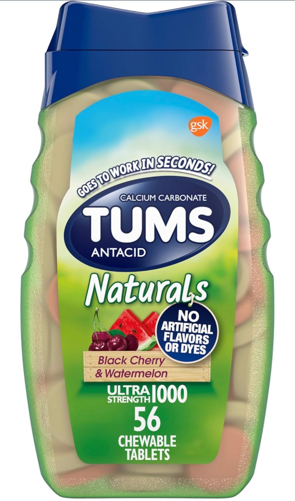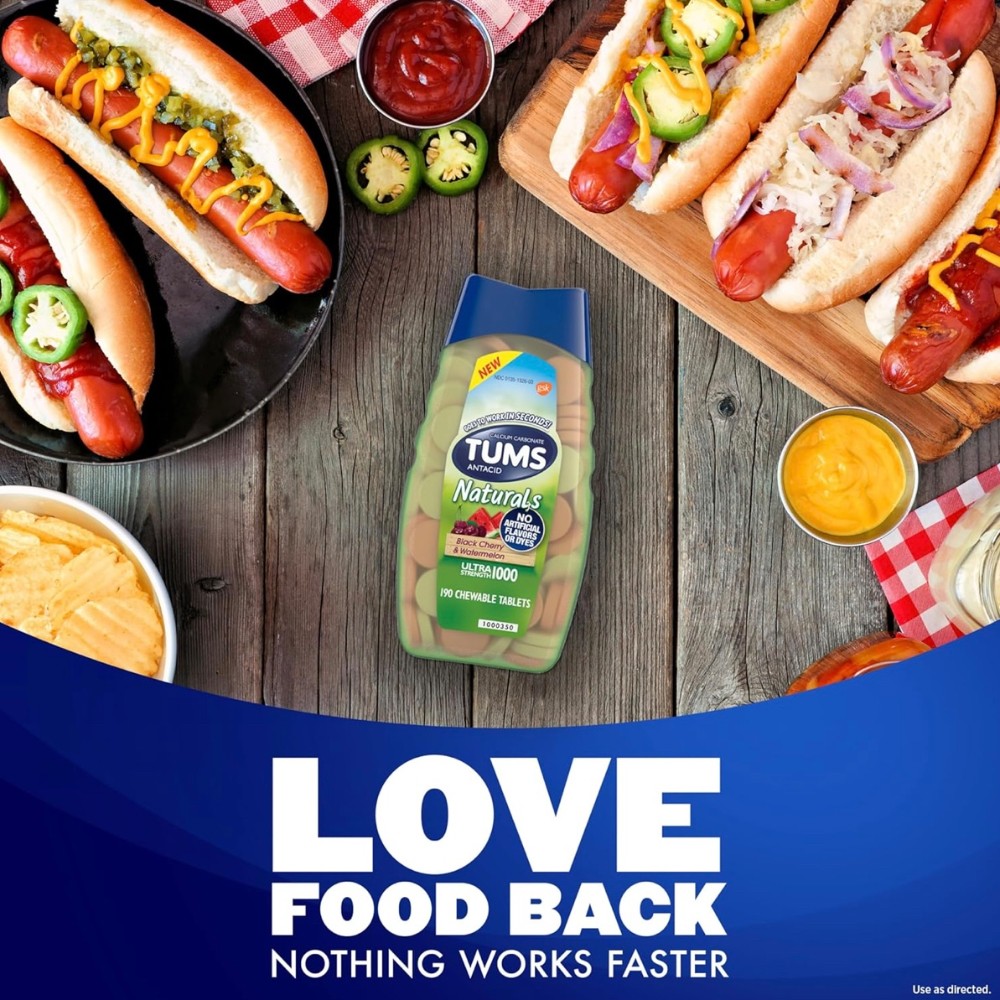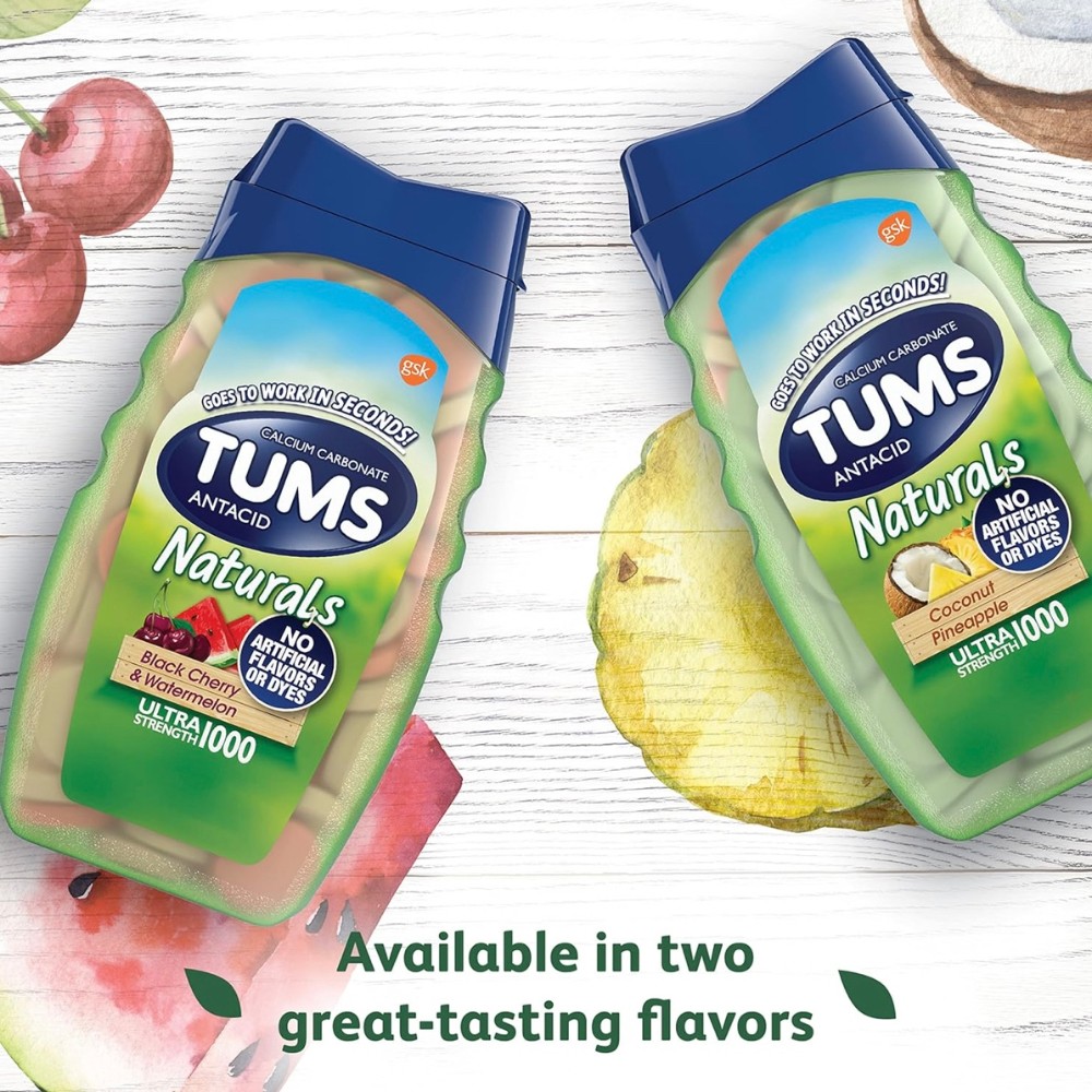 • Contents: 56 TUMS Naturals Ultra Strength Antacid Chews Black Cherry & Watermelon, provides fast-acting, ultra strength heartburn relief. Great tasting with no artificial flavors or dyes