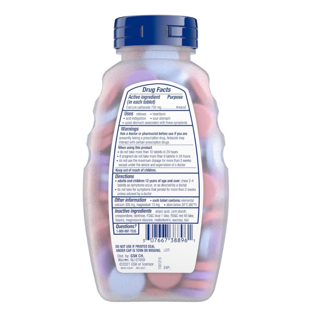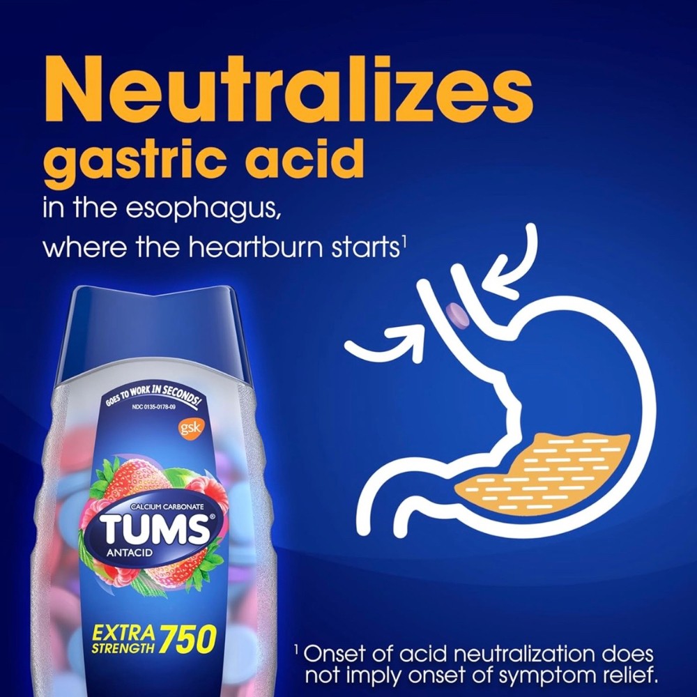 TUMS Extra Strength Antacid Tablets go to work in seconds by starting to neutralize acid on contact to bring fast and powerful extra strength heartburn relief. When symptoms occur, chew and swallow two to four tablets, depending on the severity of your acid indigestion. Featuring the active ingredient calcium carbonate, these berry flavored chewable antacid tablets relieve heartburn, sour stomach, acid indigestion and provide upset stomach relief associated with these symptoms. TUMS antacids are the number 1 recommended adult antacid brand by doctors, pharmacists and OBGYNs. It is America's number 1 antacid and trusted as a heartburn medicine for 90 years. These chewable antacids are gluten free and kosher. Packaged in a compact, resealable bottle perfect for keeping in your car or office, TUMS Extra Strength Assorted Berries antacids fight flare ups fast.