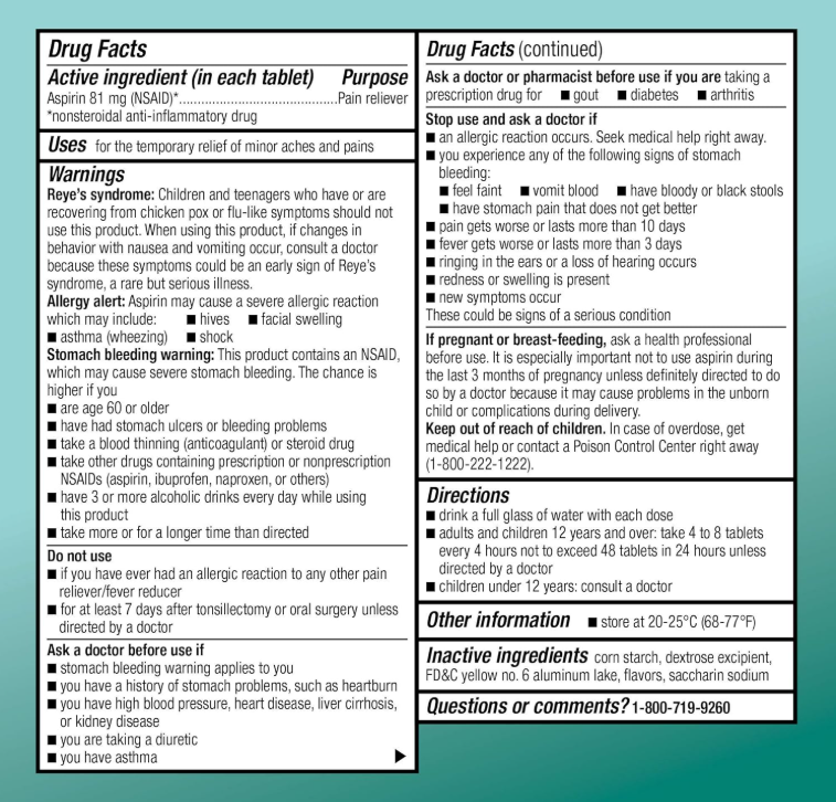 - Active ingredient (in each chewable tablet): Aspirin 81 mg (NSAID*).