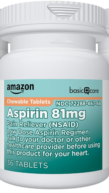 - LOW DOSE ASPIRIN: Amazon Basic Care Low Dose Chewable Aspirin 81 mg is a pain reliever for adults and children age 12 years and over; children under 12 years - consult a doctor