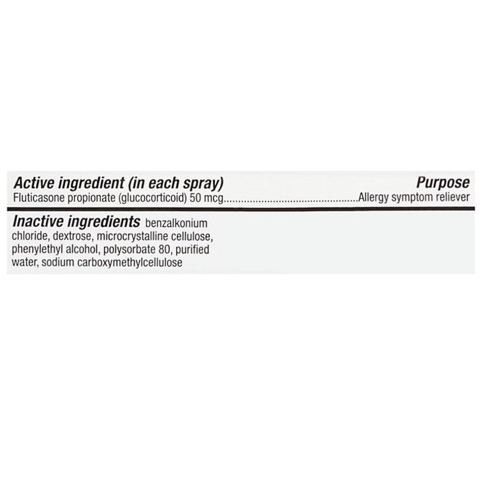 In Each Spray Warnings: Only for use in the nose. Do not spray into your eyes or mouth Do not use: in children under 4 years of age; to treat asthma; if you have an injury or surgery to your nose that is not fully healed; if you have ever had an allergic reaction to this product or any of the ingredients. Ask a doctor before use if you have or had glaucoma or cataracts. Ask a doctor or pharmacist before use if you are taking: medicine for HIV infection (such as ritonavir); a steroid medicine for asthma, allergies or skin rash; ketoconazole pills (medicine for fungal infection) When using this product: the growth rate of some children may be slower; stinging or sneezing may occur for a few seconds right after use; do not share this bottle with anyone else as this may spread germs; remember to tell your doctor about all the medicines you take, including this one Stop use and ask a doctor if: you have, or come into contact with someone who has, chicken pox, measles or tuberculosis; your symptoms do not get better within 7 days of starting use or you get new symptoms such as severe facial pain or thick nasal discharge. You may have something more than allergies, such as an infection; you get a constant whistling sound from your nose. This may be a sign of damage inside your nose.; you get an allergic reaction to this product. Seek medical help right away; you get new changes to your vision that develop after starting this product; you have severe or frequent nosebleeds. If pregnant or breast-feeding, ask a health professional before use Keep out of reach of children. In case of overdose, get medical help or contact a Poison Control Center right away (1-800-222-1222). Do not use if printed neckband is broken or missing.