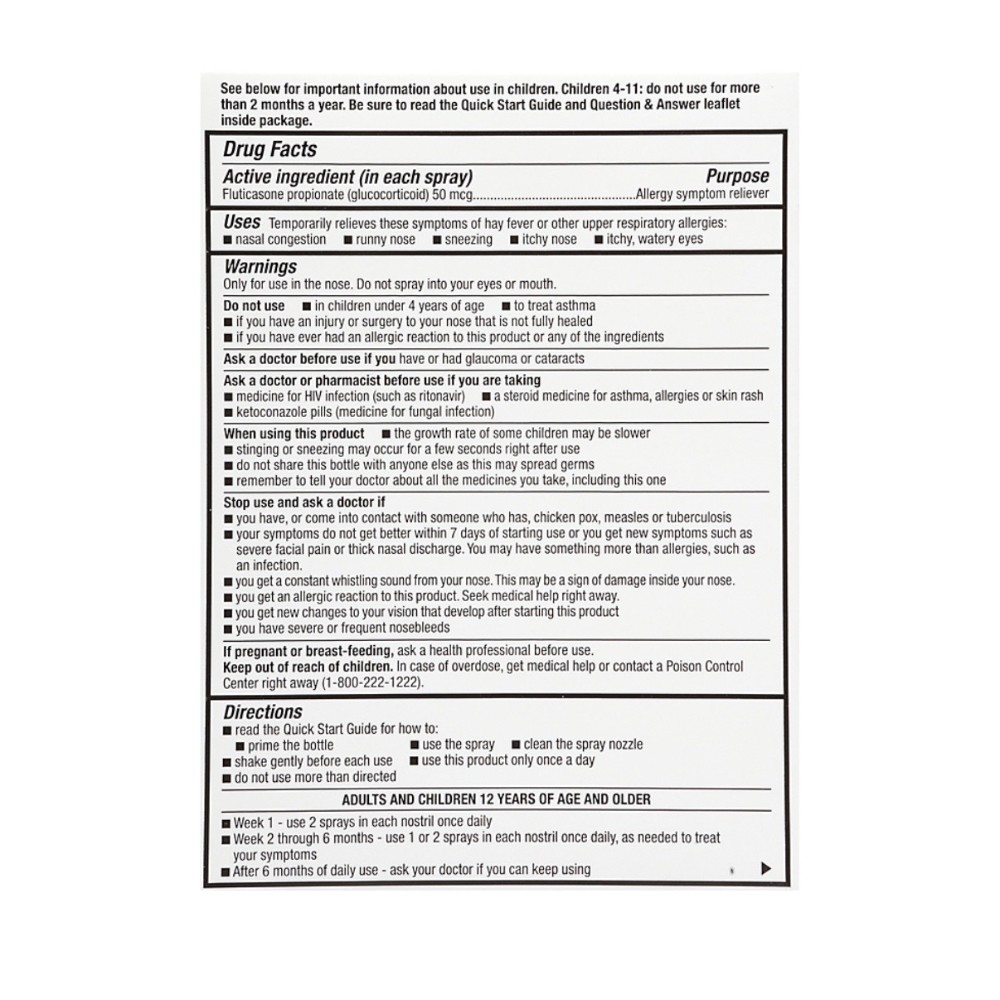In Each Spray Directions: Read the Quick Start Guide for how to; prime the bottle; use the spray; clean the spray nozzle; shake gently before each use; use this product only once a day; do not use more than directed. See below for important information about use in children. Children 4-11: do not use for more than 2 months a year. Be sure to read the quick start guide and question & answer leaflet inside the package. Adults and Children 12 Years of Age and Older: Week 1 - use 2 sprays in each nostril once daily. Week 2 through 6 months - use 1 or 2 sprays in each nostril once daily, as needed to treat your symptoms. After 6 months of daily use - ask your doctor if you can keep using. Children 4 to 11 Years of Age: The growth rate of some children may be slower while using this product. Children should use for the shortest amount of time necessary to achieve symptom. An adult should supervise use. Use 1 spray in each nostril once daily. Children Under 4 Years of Age: Do not use.