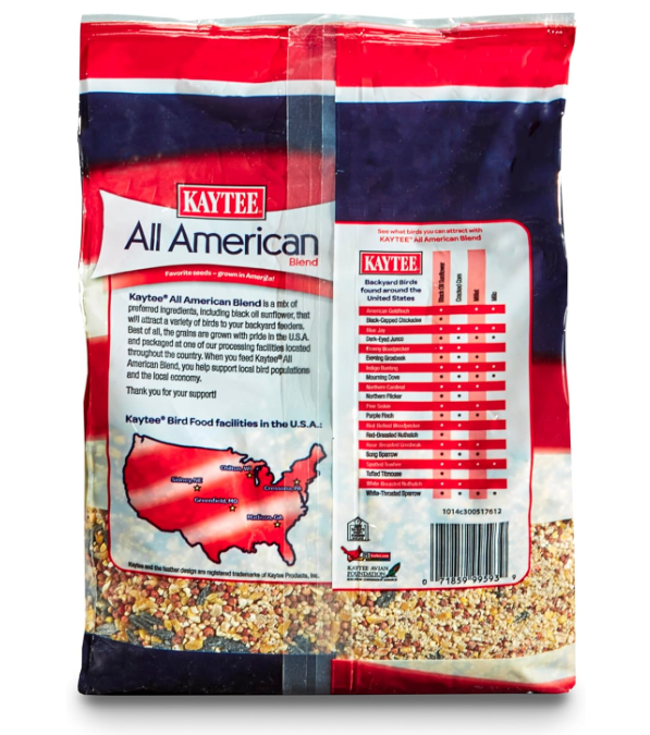 Kaytee All American Blend is a mix of bird-preferred grains, grown and packed with pride in the USA. If you're looking to make your feeder a draw for wild birds, begin by adding Kaytee All American Blend to it. This delicious and nutritious blend is a favorite of a variety of wild birds, and with good reason. It includes a mix of ingredients birds in the wild love and respond to, including black oil sunflower.