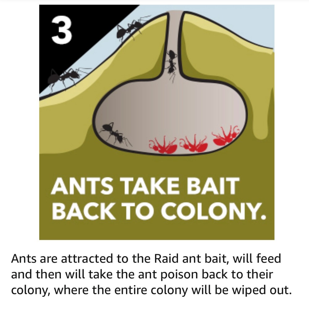 • After ants feed on this Raid Ant Bait, they return to the colony and transfer the bait to the queen and others, thereby killing the entire colony.