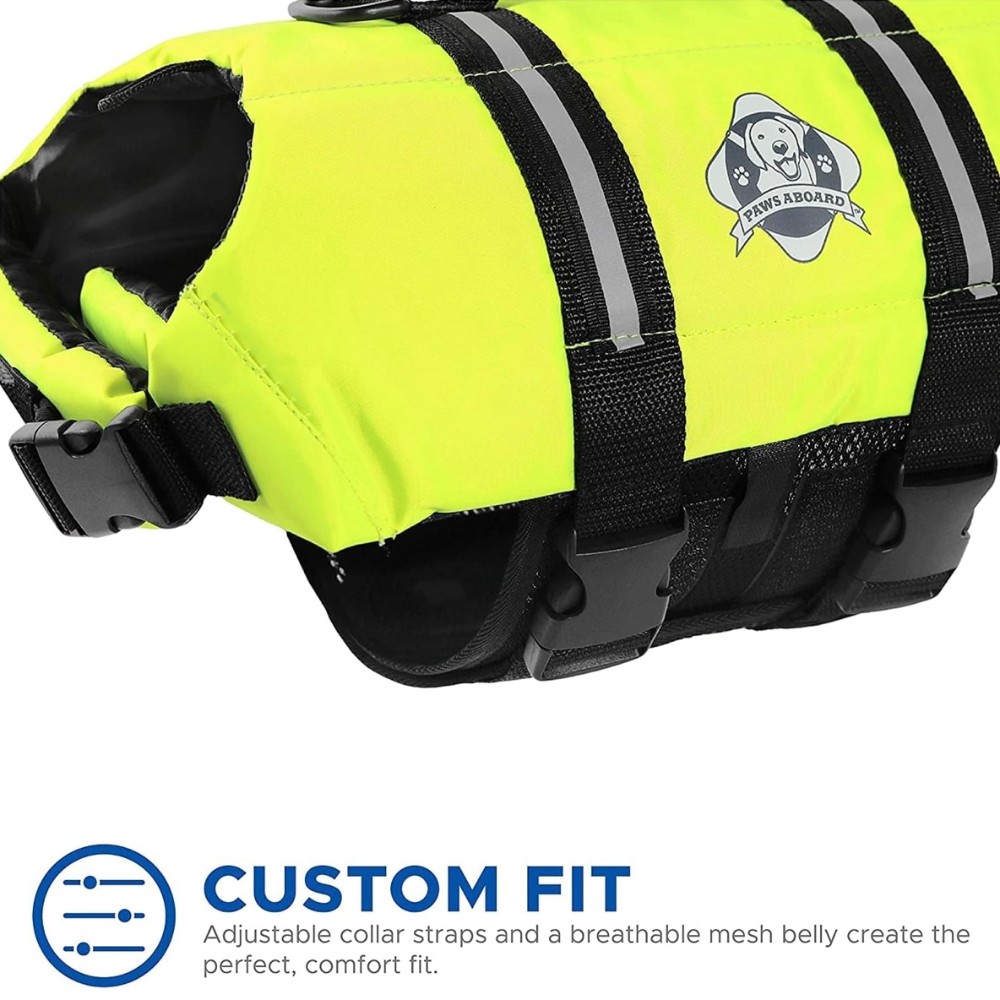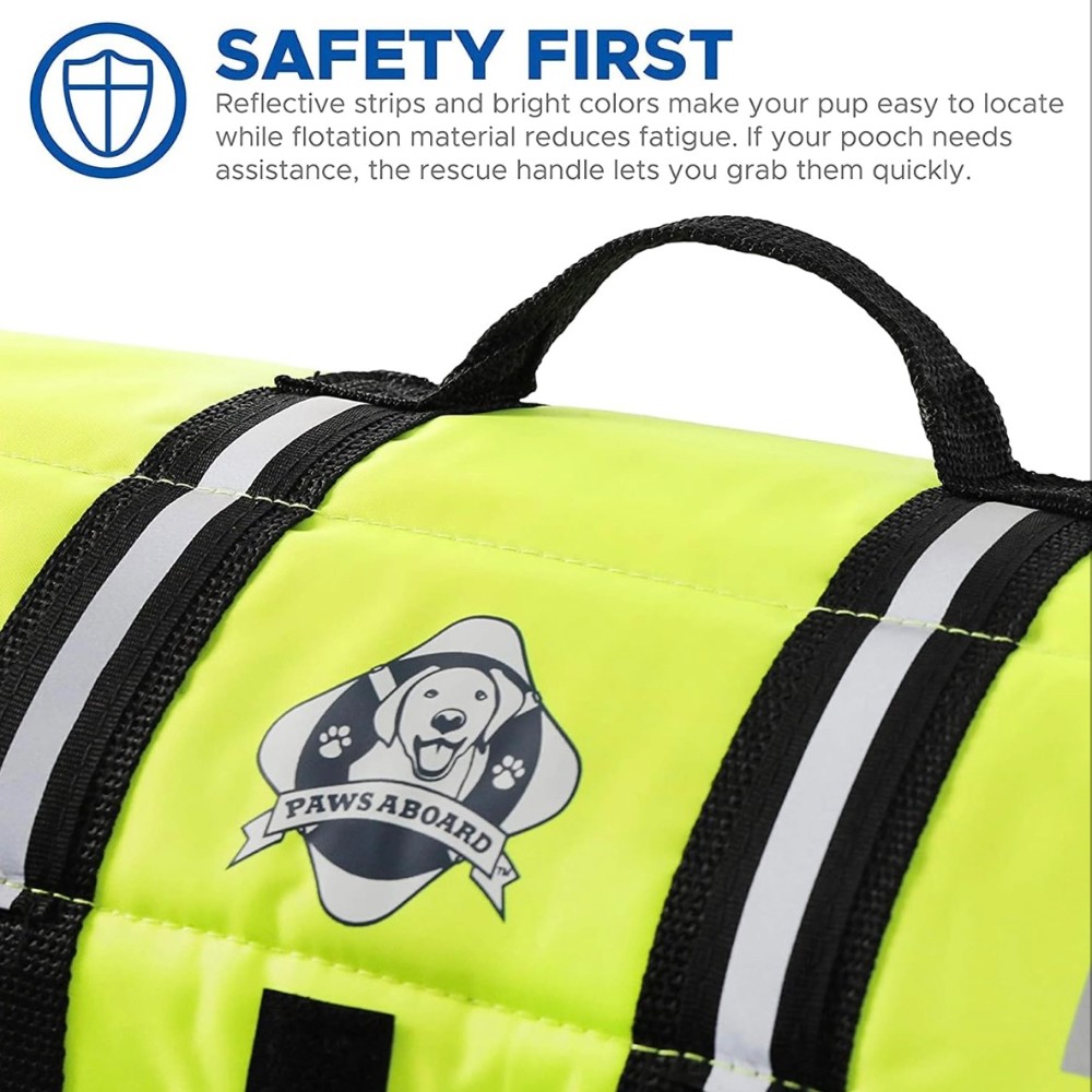 - PAWS Aboard Pet Life Jackets and Designer Pet Life Jackets provide ultimate buoyancy and high visibility to keep pets safe in or around the water. Constructed to provide buoyancy, along with a cozy secure fit, the PAWS Aboard Pet Life Jackets features: An advanced breathable mesh underbelly for proper draining and drying, which provides your dog more comfort and healthier conditions than traditional pet life jackets, which can cause heat exhaustion and chafing. Key Features: New reflective strips for maximum visibility Bright colors and unique designs Handle on top for quick and easy grabbing Adjustable nylon straps Quick-release buckles Heavy-duty yet more comfortable Velcro® fastening system around the belly and neck to keep securely fastened.