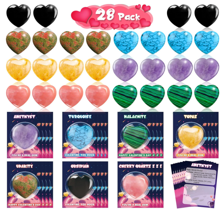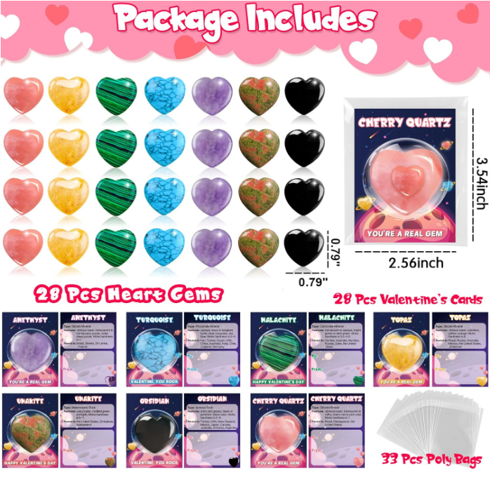 - Valentines Day Gift for Kids: You'll get a 28 pack of Valentines for kids, including 28 pcs heart healing crystals and stones in 7 types (4 pieces each), 28 pcs Valentine day cards and 33 pcs clear bags for packing, enough for your kids to share with their classmates or friends in the classroom.