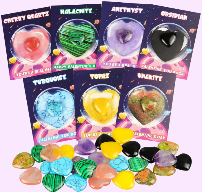 - Heart-Shaped Natural Gem Rocks: These Valentines feature 7 different natural gemstones from around the world, including: Malachite, Unakite, Obsidian, Turquoise, Amethyst, Cherry Quartz, Topaz. Polished in heart shape for love, this rock collection valentines day gift is the perfect way to express love and inspire a lasting love of geology for all.