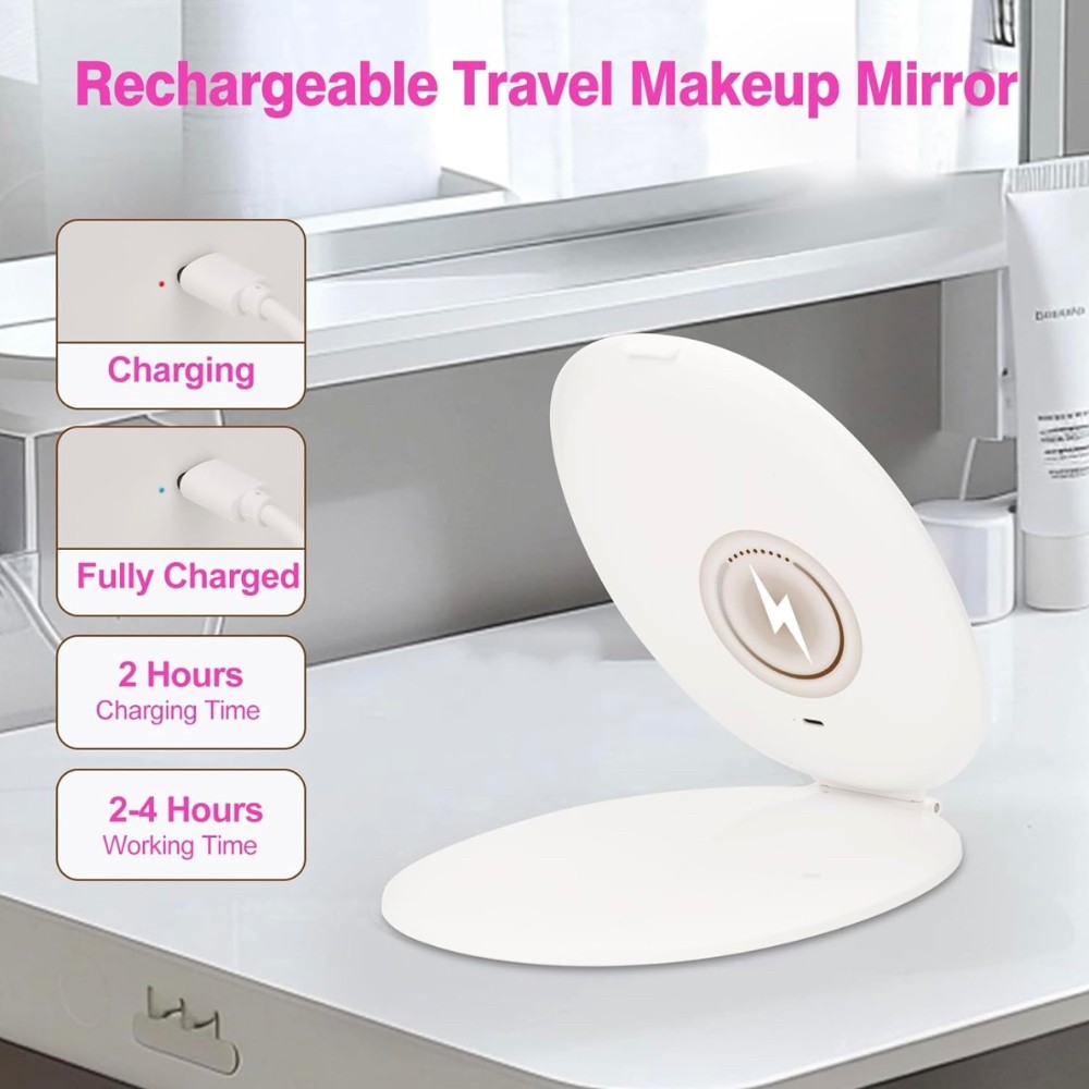 • [Rechargeable Lighted Mirror) The travel Light up mirror is built-in 500mAh Lithium battery comes with a USB Type-C charging cable. Charge for 2 hours and work for 2-4 hours, with up to 2 hours of continuous use at maximum brightness.