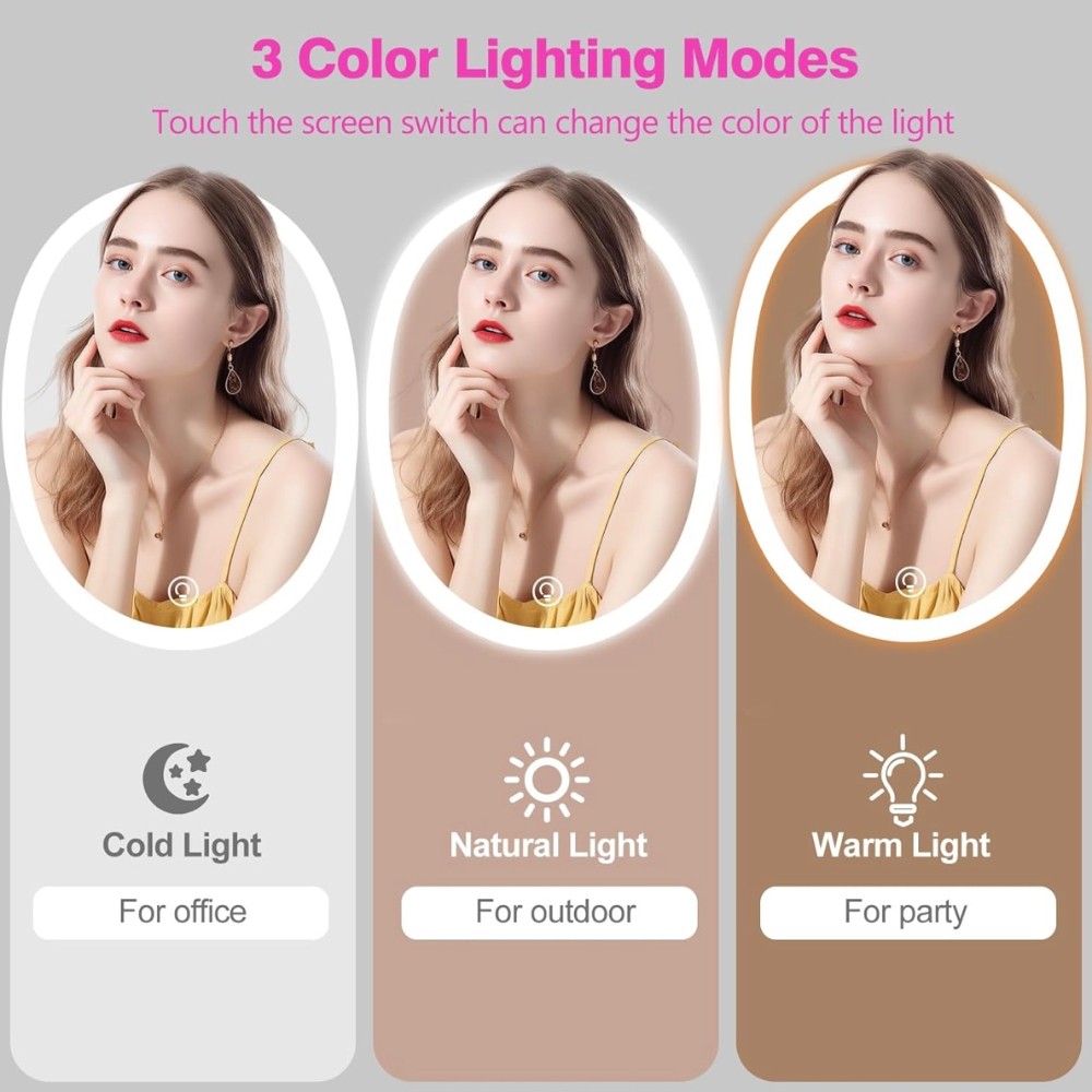 • 13 Color Lighted Makeup Mirror) This lighted travel makeup mirror offers 3 lighting modes - cold light, natural light and warm light. tap the smart touch sensor button to switch, to meet various makeup needs. Cool light for offices.