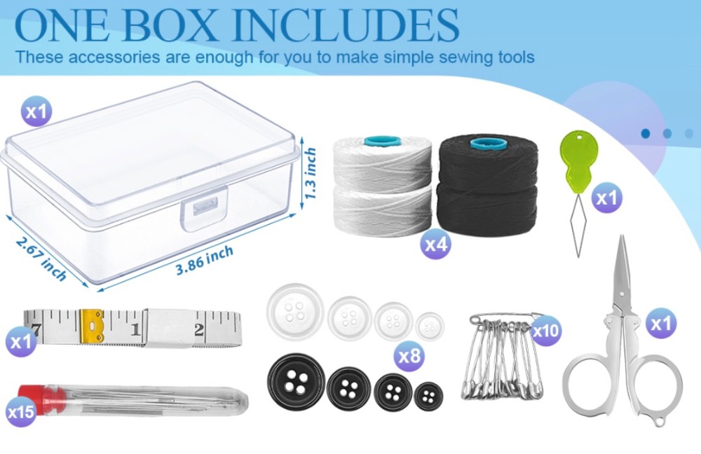 - Included Components: Scissors, Measuring Tape, Threads, Needles, Safety Pins, Buttons, and a Needle Threader